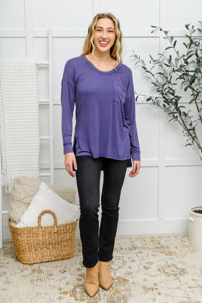 The Long Sleeve Knit Top With Pocket In Denim Blue features a lightweight, stretchy fabric that shapes a round neckline with long sleeves, and a hi-low hem with side slits. A chest patch pocket decorates a loose fit bodice for a comfortable and stylish look.