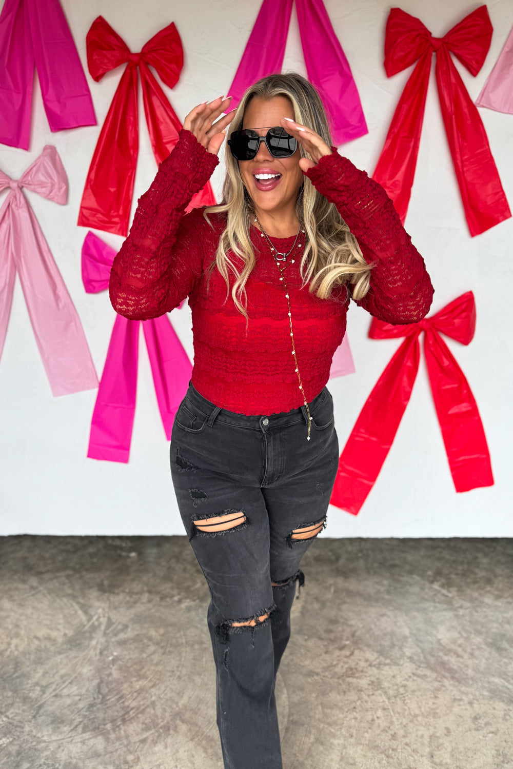 Feminine, flirty, and effortlessly chic—this lace top features a sheer stretchy layered lace bodice sleeves and back. The fitted silhouette hugs in all the right places while still offering comfort and movement. Super cute for layering and perfect for dressing up denim or wearing under jackets — sweet, soft, and so versatile.