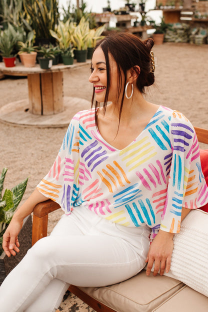 The Stamped By Love Tops is not only chic, but bold and unique! A lightweight rayon fabric makes up a relaxed fit bodice, v-neckline, and three quarter circle sleeve cut. A unique three striped print in pink, orange, blue and yellow decorates this top throughout. Pair with light wash jeans and white sandals for a cute spring fit!